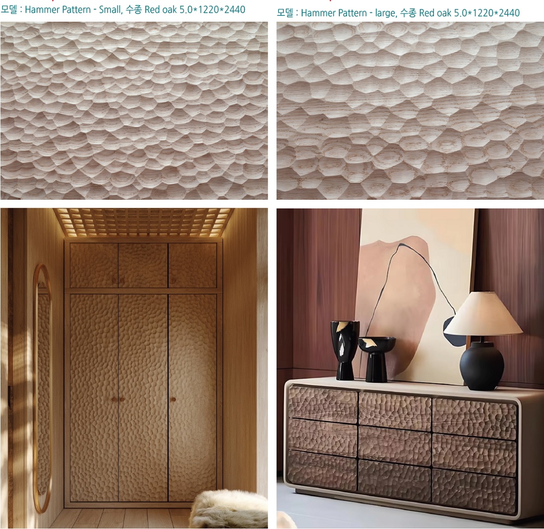 · CNC 가공은 우리가 상상하던 패턴을 현실로 만들어 줍니다. KD가 공급하는 3D 우드월 패널은 가구난 씽크대, 도어 등의 주요한 디자인이 될 수 있습니다. 목재는 천연 엔지니어링 우드로 제작되며, 엔지니어링 우드는 천연 목재가 만들수 없는 다양한 질감과 컬러를 제공합니다.