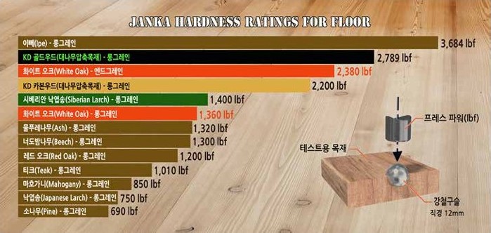 그리고 아주 특별한 공간이나 사람을 위해 제공되는 바닥재가 있는데 그것은 바로 유럽산 화이트오크로 만든 엔드그레인 플로어입니다. 이 마루재의 얀카 하드니스 수치를 보면 2,380 Ibf(파운드힘)에 달하는데 미터법으로 환산하면 약 1,080 킬로그램힘 [kgf]을 가해야만 직경 12mm 쇠구슬이 마루재 표면에 50% 박힌다는 의미이며, 이는 대나무 압축목재인 카본우드와 골드우드의 중간에 위치할 강도로 탁월한 내구성과 내마모성을 나타냅니다.