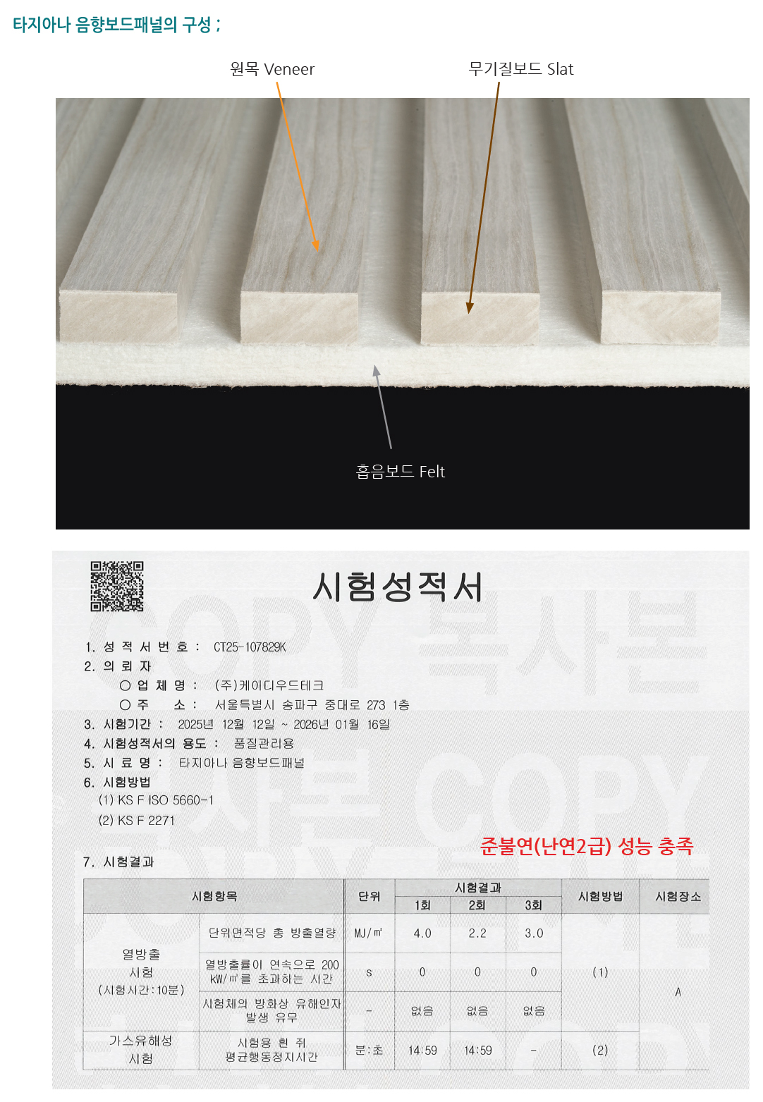 • 실리콘 미네랄로 만근 슬랫(Slat,쫄대)는 준불연 등급 인증 제품으로 원목 베니어(무늬목)을 접착하여 만듭니다.