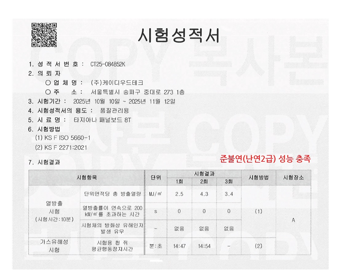생명과 재산을 보호하는 타지아나 난연패널보드 - 난연 2급 준불연 성능 인정