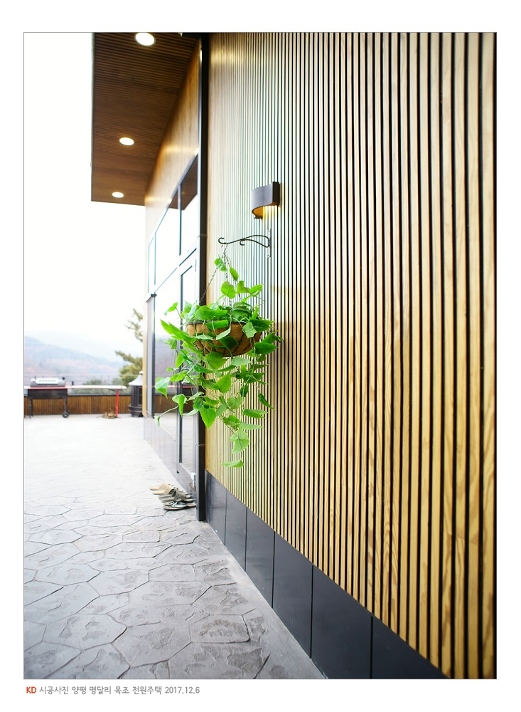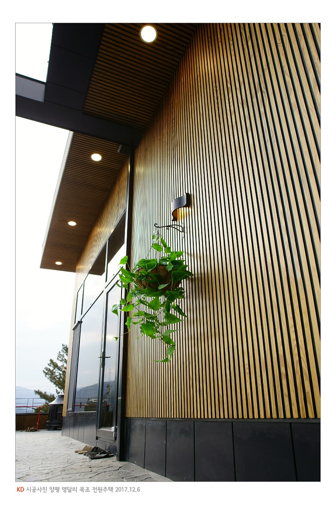 "건물 외벽을 디자인하다"라는 모토 아래 (주)케이디우드테크가 2011년도에 선보인 투톤 컬러 착색, 스트라이프 디자인의 미국 남방소나무(SYP) 탄화목 찬넬 사이딩은 요즘 전원주택 외관의 핫 키워드가 되었다. 현관 주변이나 창틀 주변의 건물 외관 포인트를 살려주는 소극적인 채용을 떠나 외벽 전체나 심지어 처마나 주차장의 천장 마감재로도 적극 채용하는 추세다. 본 건물에도 디자이너가 (주)케이디우드테크의 케이디리브 탄화목 사이딩을 얼마나 폭 넓게 사용했는지 잘 알 수 있다. 특히 일반 목재와 달리 (주)케이디우드테크의 탄화목 사이딩은 사시사철 기후변화가 무쌍한 우리나라 환경에서도 뒤틀림이나 변형이 거의 없어서 설계자의 의도가 오랜 기간 아름답게 지속된다는 것이 장점이며, 옹이 하나없이 완전 무절에 가까운 외관은 깔끔하고 정갈한 정서에 잘 부합한다고 할 것이다. 더군다나 개발 초기와 달리 요즘은 코너나 창대 두겁 등을 간편하게 이어 붙일수 있는 각종 전용 몰딩 등이 개발되어 한결 간편한 시공과 심플한 디자인을 제공한다.