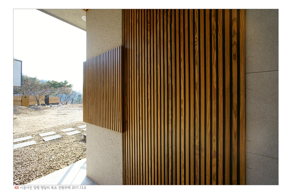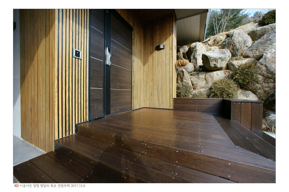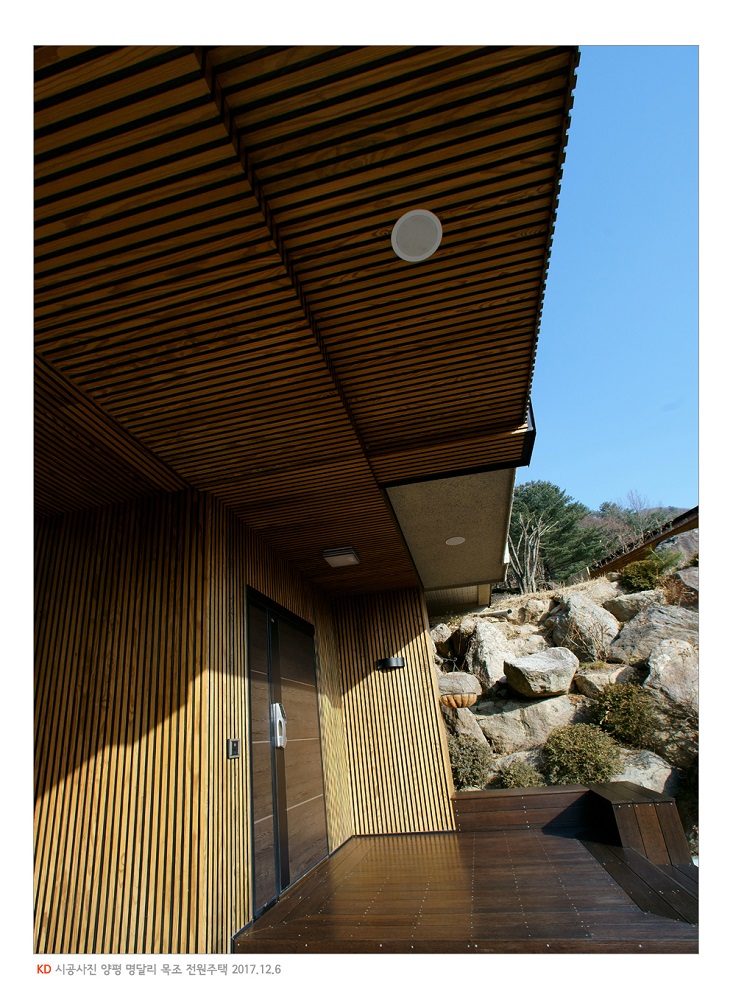 양평군 서종면 명달리의 주택은 이러한 (주) 케이디우드테크의 제품군을 최대한 활용하여 내외 디자인을 완성한 격조 높은 주택이다. 일반적으로 목제품을 인테리어 소재로 사용하게 되면, 우리 몸에 유익한 '피톤치드'의 산림욕 효과를 볼수 있으며, 대리석이나 황토 등에서 염려되는 대표적 발암 물질 "라돈"에 대한 걱정을 덜 수있다. 보온 단열 기능과 습도 조절 기능도 다른 소재들에 비해 우수하기 때문에 늘 쾌적한 실내공기를 유지할수 있다.