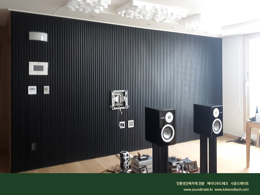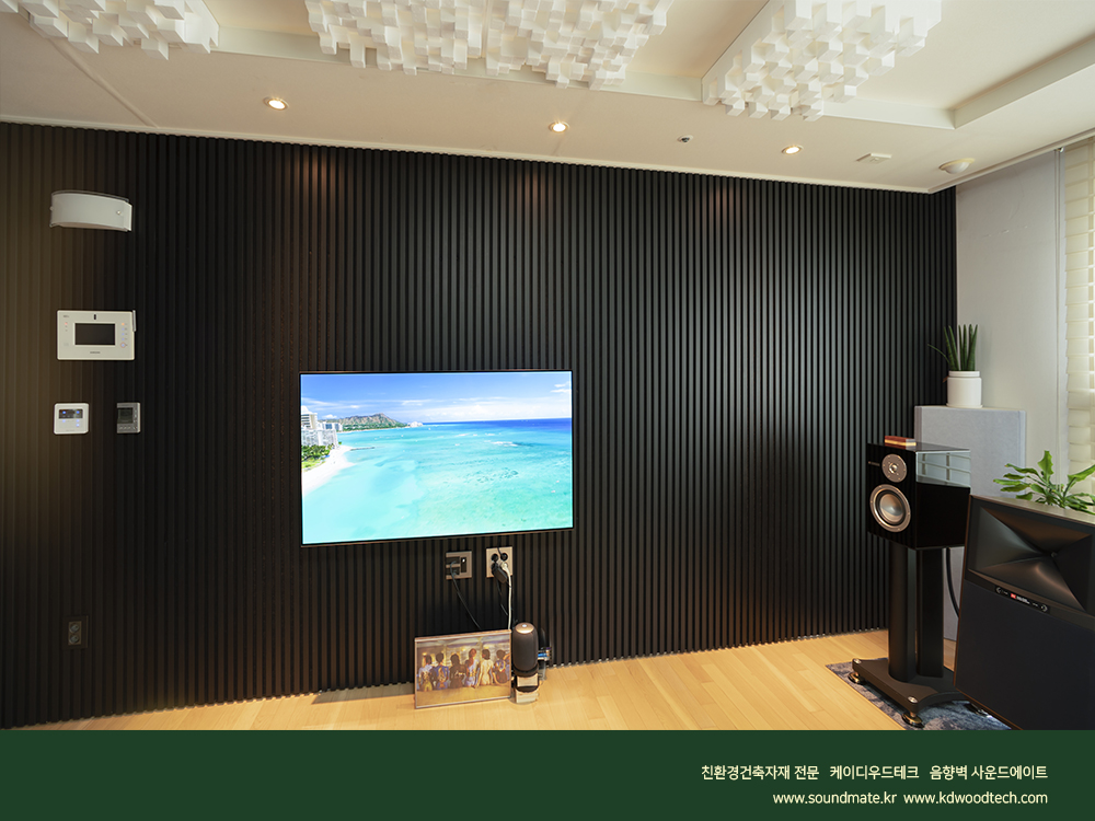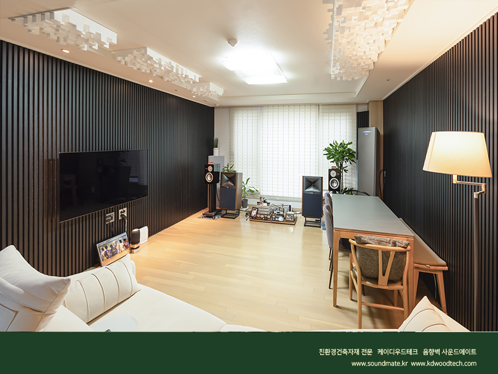 [ 사운드메이트 ] 목재음향벽 어쿠스틱 보드패널 오동나무 프라임우드 .블랙노이르 컬러로 완성된 거실 TV벽과 소파월 인테리어