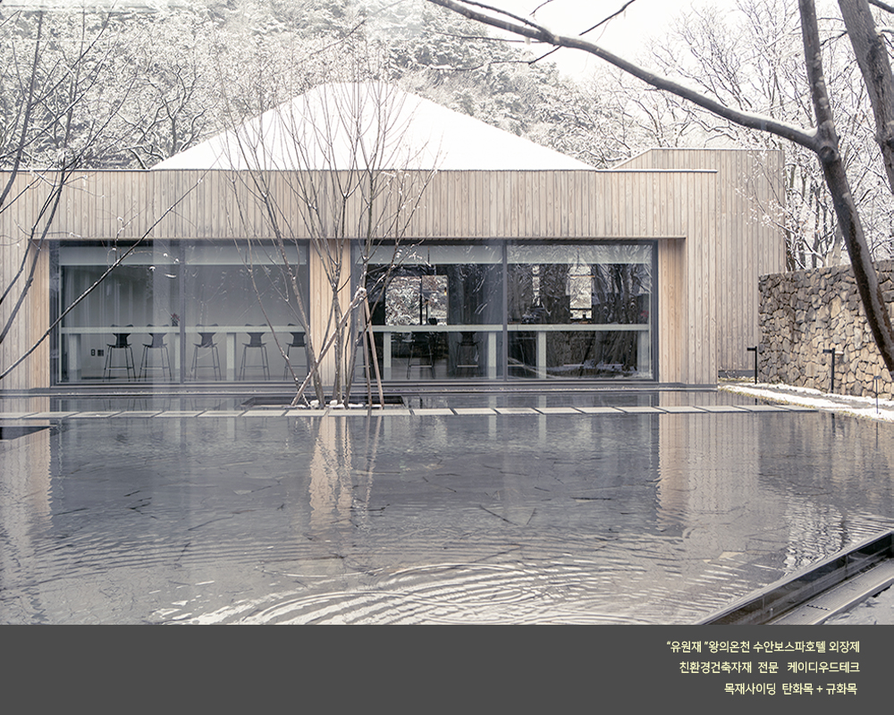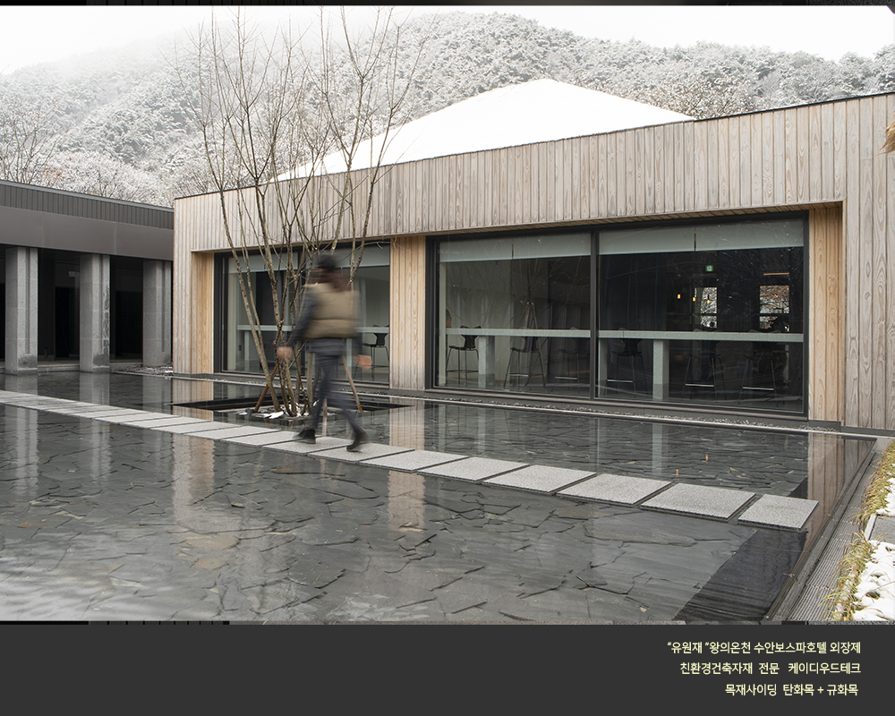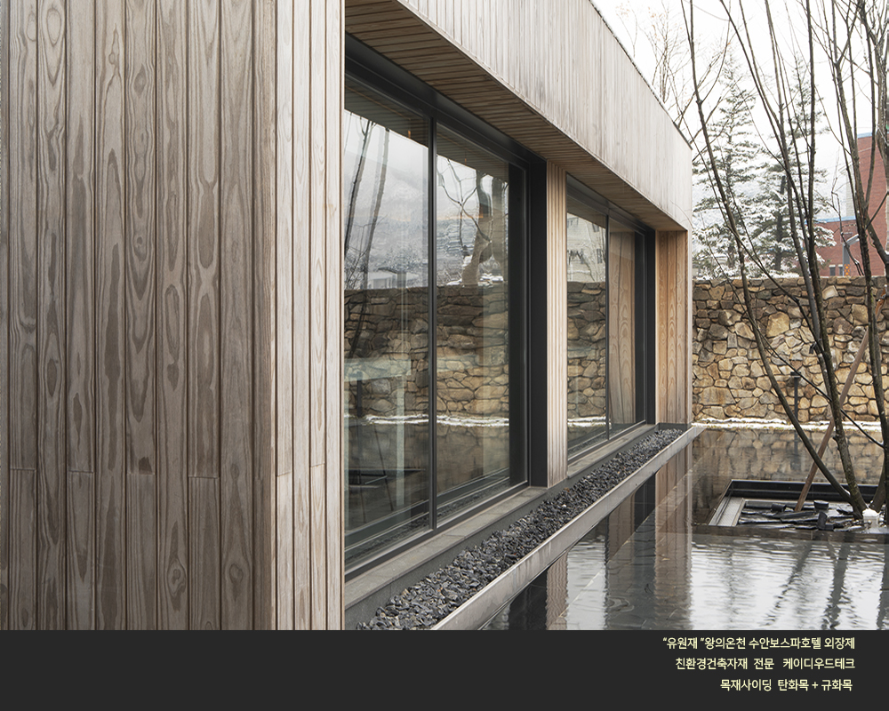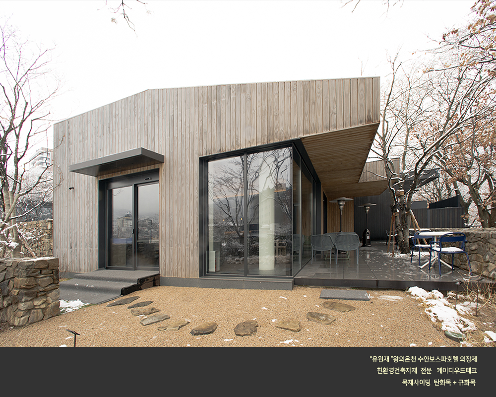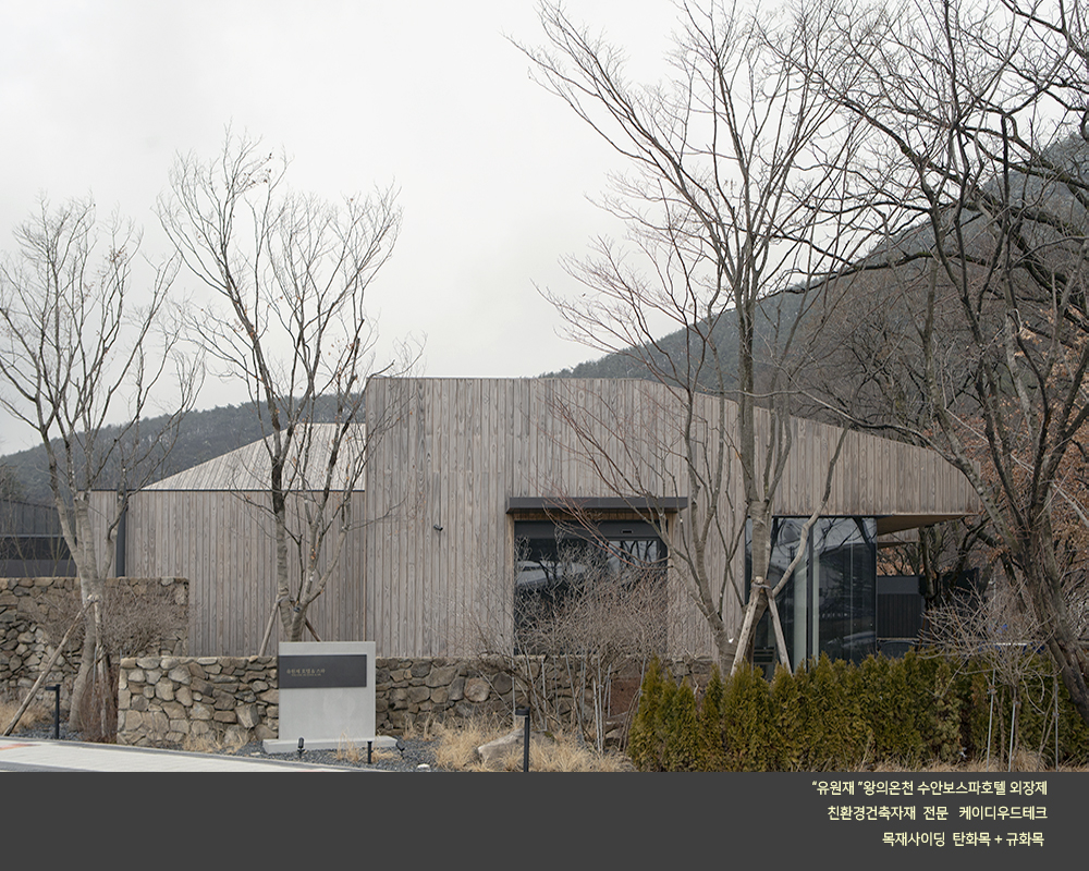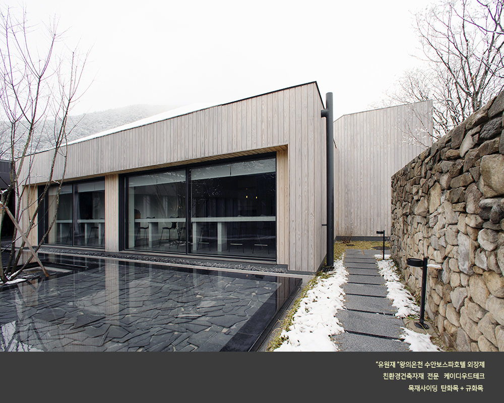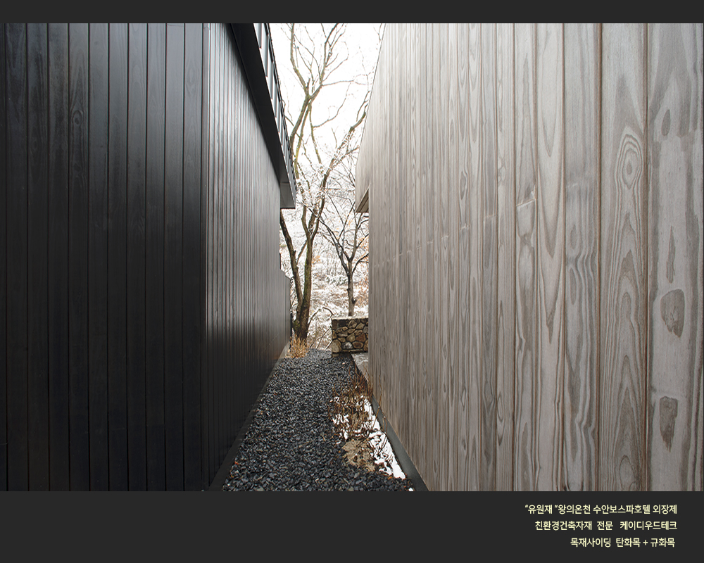 수안보 온천호텔 "유원재" 외장에 케이디우드테크의 탄화목과 규화목이 시공되었습니다.