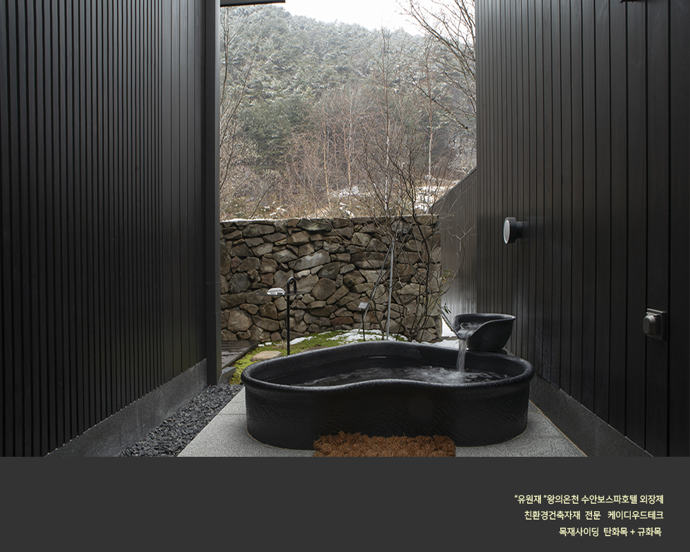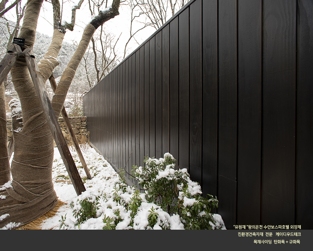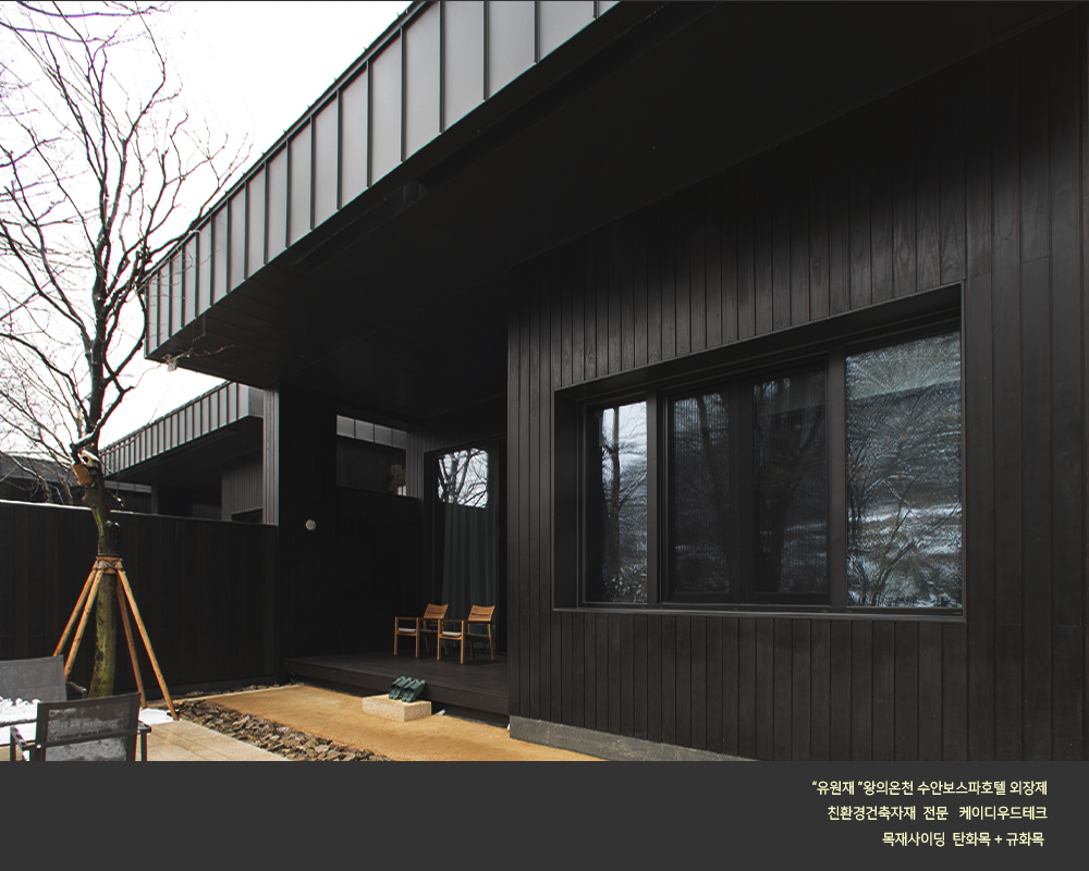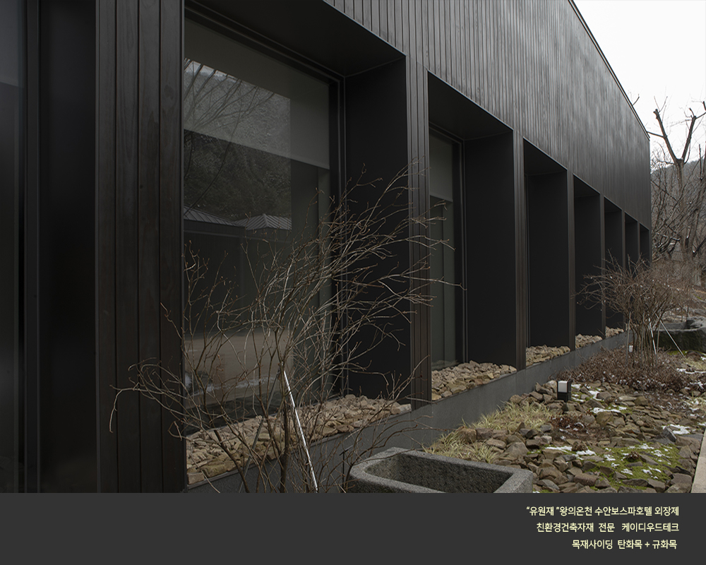 수안보 온천호텔 "유원재" 외장에 케이디우드테크의 탄화목과 규화목이 시공되었습니다.