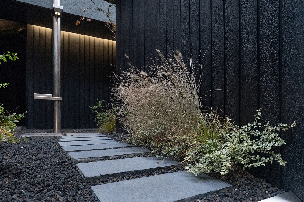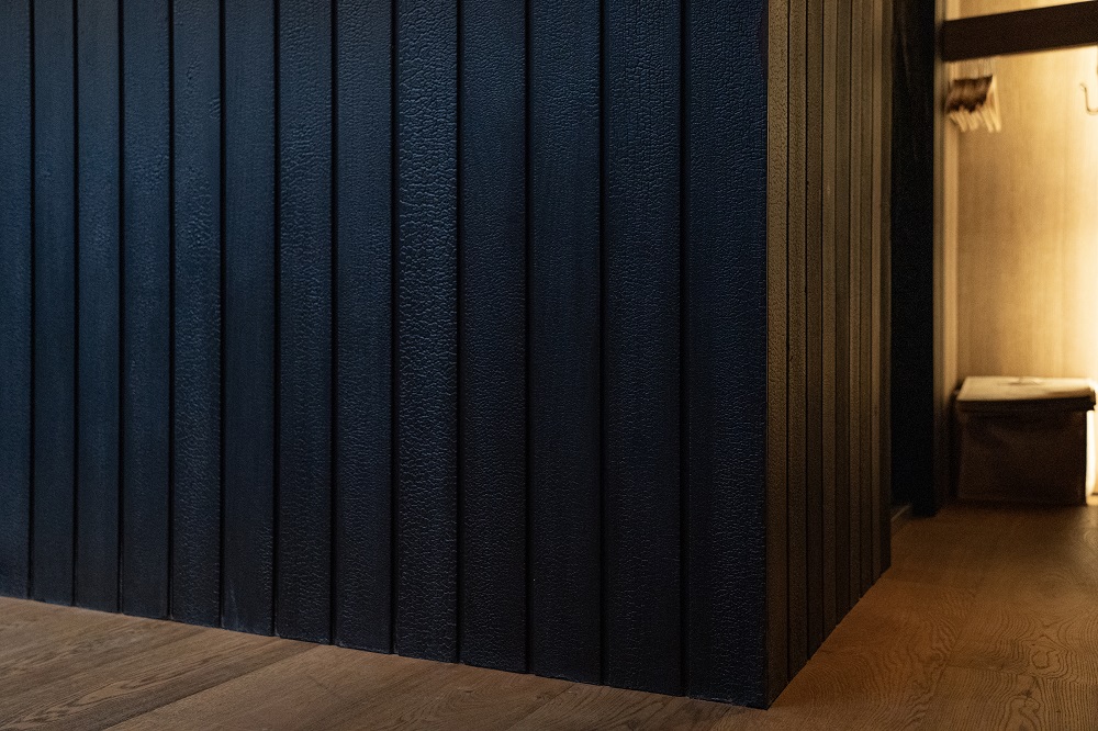 탄화목 특유의 거칠지만 섬세한 질감과 깊은 블랙 컬러가 주변의 번잡함에서 벗어나 오직 공간 자체에 몰입하게 만드는 웅장하고 미니멀한 입구를 완성합니다.