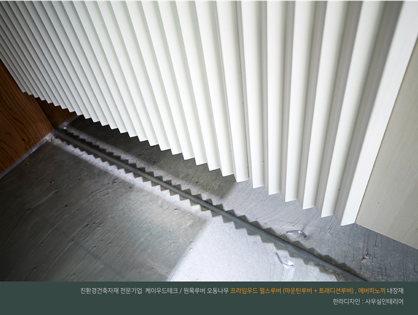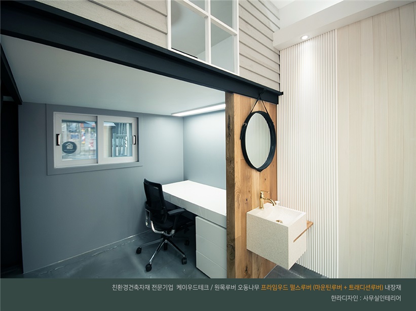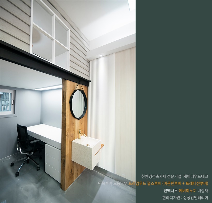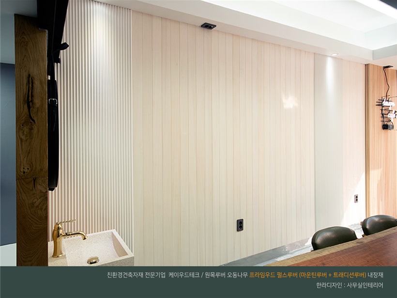 인테리어어 사무실에 케이디우드테크 주요 인테리어 내장재로 마감되었습니다.