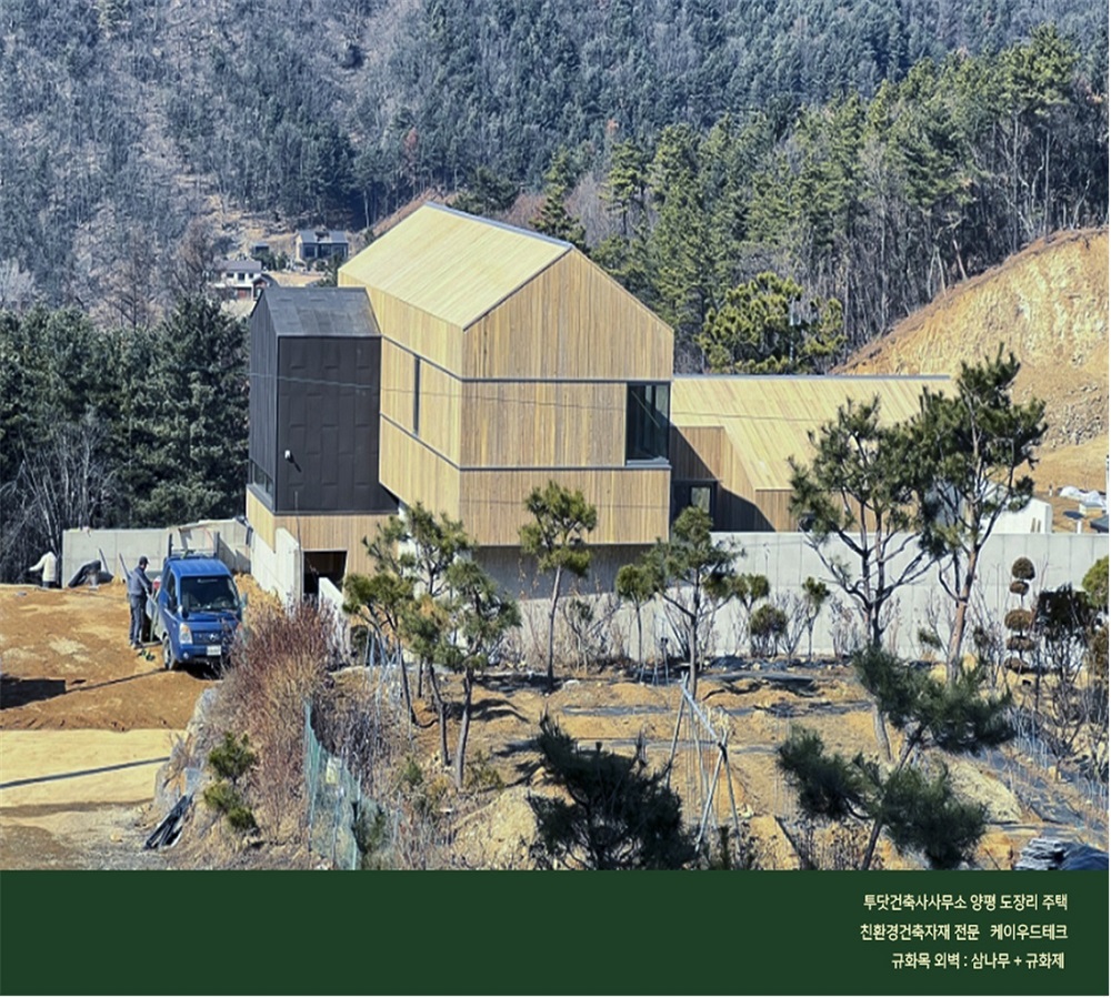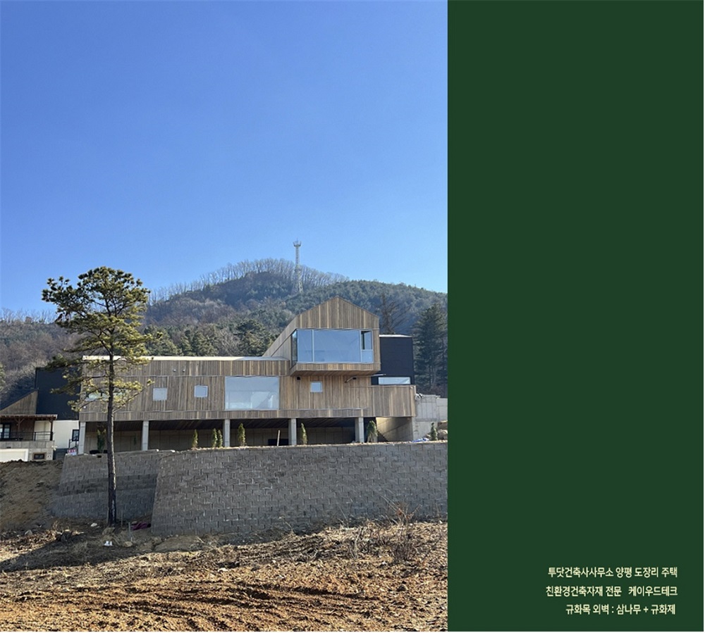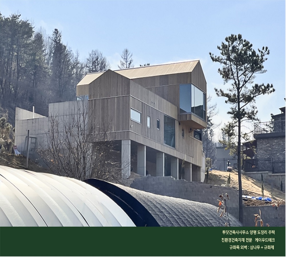 목재 외벽으로 완성된 집으로서 삼나무와 규화제로 마감하여 시대에 앞서가는 친환경 주택일뿐 아니라 ,기후변화를 예방하고 탄소배출 저감에 기여하며 보온단열에 있어서 그 어떤 건축 마감재보다도 훌륭하여 냉난반비를 절감할수 있습니다.
