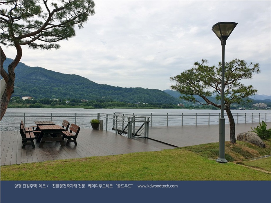 방부목으로 오랜 세월이 지난 수변 데크 교체 공사는고압축 탄화목인 골드우드로 진행되었다.
