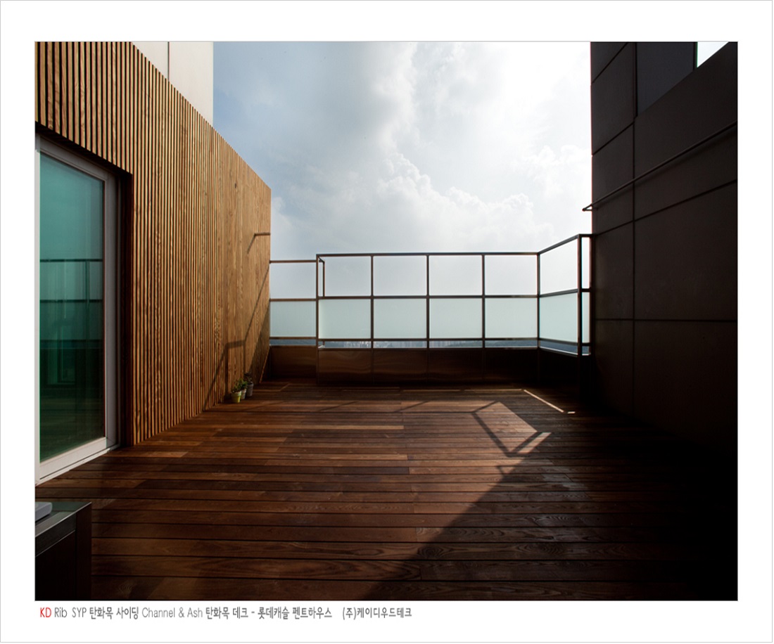 사용제품 :바닥 데크 : KD 리브 ASH(물푸레나무) 탄화목 데크 20mm(두께) * 100mm(폭)