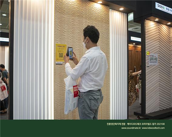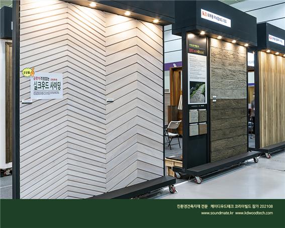 전제품 친환경을 추구하는 ㈜케이디우드테크는 목재 건축자재를 고집하며,건강과 아름다움 그리고 가격까지 고려하여 가장 환영받는 건축자재로 인정 받고 있으며 코리아빌드 건축박람회에 참가하여 관람객의 최고 인기를 모았다. 전국의 건축설계사와 지자체의 안전한 주민시설,주택단지 타운하우스 빌라 개발 업체와 카페등 상업공간에 케이디우드테크의 신기술과 신제품을 파악하기 위해 내방했다. 지속적인 인기를 모으고 있는 탄화목 외장재, 편백나무 무절 원목루버,벽지대신 친환경도장 오동나무 원목루버, 아트월 ,골드우드 데크와 신기술 제품으로서 관리가 필요없고 썩지않는 규화목 데크와 사이딩 , 음향인테리어 사운드메이트는 최고급 인테리어와 외장재로 고객의 관심과 폭증시켰다.
