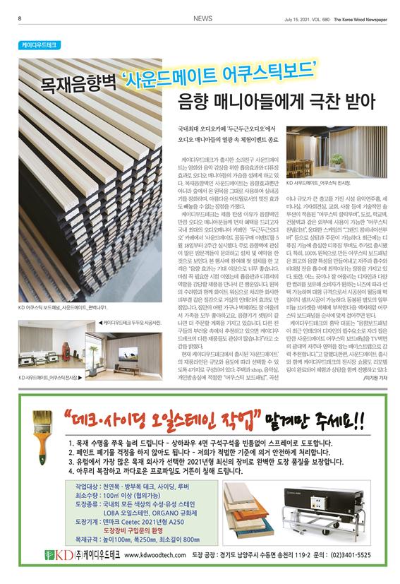 언론보도&광고 [언론보도] [ 한국목재신문 ] 2021.7.19 목재음향벽 ‘사운드메이트 어쿠스틱보드’ 음향 매니아들에게 극찬 받아 2021…