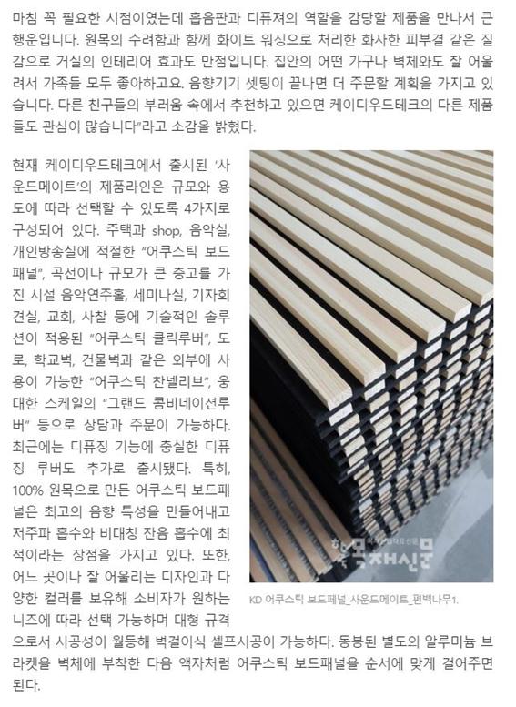 한국목재신문에서는 케이디우드테크의  음향특성을  지닌  건축자재   "사운드메이트 "  브랜드 출시에  따른  관련소식을  지면과 더불어 목재신문  홈페이지에 개재했습니다.