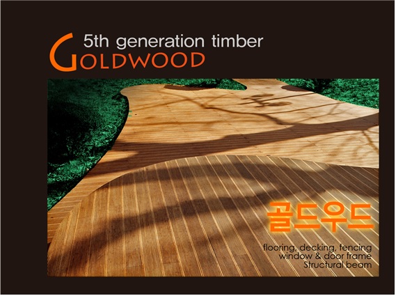 a. 제5세대 천연 공학 목제 < 골드우드 > : 자투리 목재를 활용하여 최첨단 장비와 기술로 탄생시킨 제5세대 공학 목재를 소개합니다. 외장재, 창호재, 내장재, 구조재로 새롭게 선보이는 놀라운 목재의 세계.... 초고압축 천연목재 카본우드를 국내에 처음 소개한 당사에서는 한층 진보되어 풍력발전기의 날개 제작에 채용되어, 년 6,000시간 20년 동안의 내구성을 보장하며, 시속232km의 허리케인에도 끄떡없는 제품을 선보입니다. 금번에는 각종 조경시설 자재로 변모하여 선보입니다. 4세대 목재인 카본우드가 기존의 목재들이 갖고 있던 문제들을 극복하고 여러가지 탁월한 특성을 가지고 있음에도 불구하고 Outdoor용으로 사용하기에는 미흡하였습니다. 추운 겨울과 고온 다습한 여름을 보내야 하고, 자외선에 지속적으로 노출되어야 하며, 수 많은 미생물과 해충, 곰팡이 등을 비롯한 각종 부패균, 그리고 대기 중의 화학 물질 들에 대응하기에는 어려움이 많았습니다. 그래서 개발된 목재가 골드우드입니다.