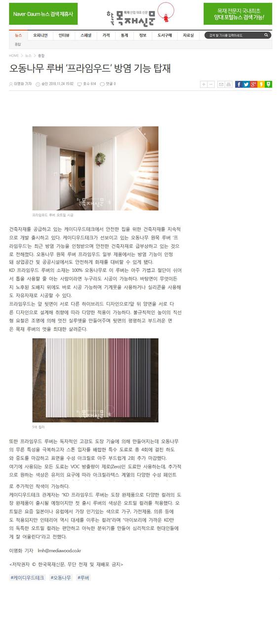 언론보도&광고 [언론보도] [ 한국목재신문 ] 오동나무 루버 '프라임우드' 방염기능 탑재 2019.2