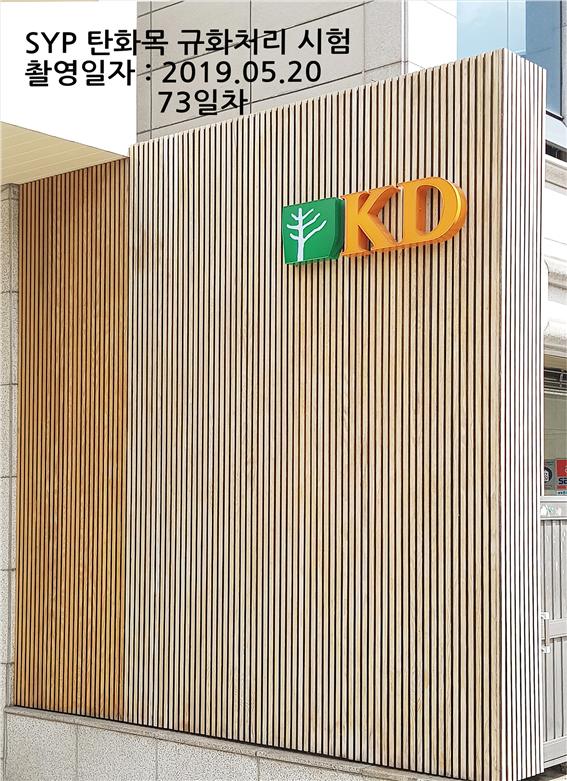 본사 전시장의 외벽 간판 사이딩에 규화목 처리한 현장 사진입니다. 직접 오셔서 확인 가능합니다.