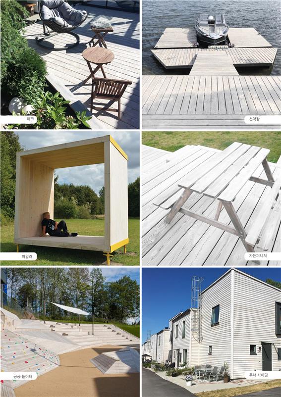 정원과 옥상, 테라스에 설치되는 데크의 수요가 점점 늘어나는 가운데 내구성과 기능성, 미적 요소, 관리와 비용까지 고려한 천연 방부 기능의 규화 처리 목재다. 건축물의 외벽에도 설치가 가능하며 시우 규화제와함께 목재 건축 자재를 한층 안전하고 아름답게 설계할 수 있다.