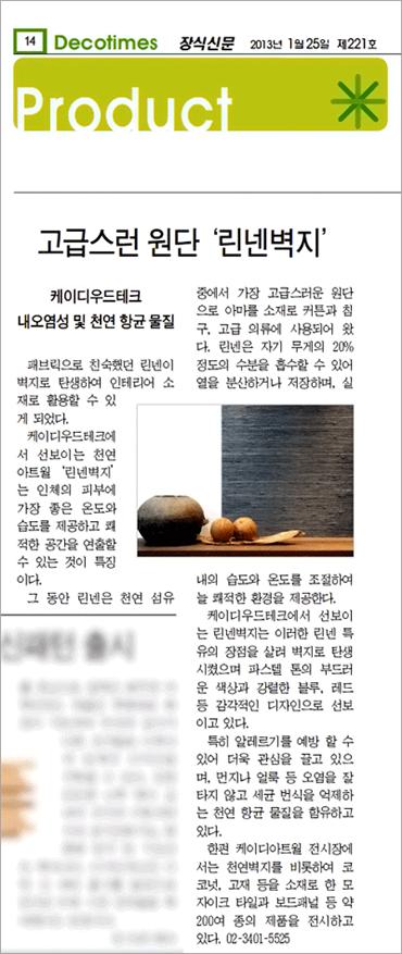 언론보도&광고 [언론보도] 장식신문 - 1월호 [ 고급스런 원단 ] 린넨벽지 2013.1