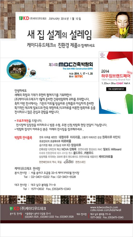 34회 MBC 동아전람/ 10회 2014 하우징브랜드 건축박람회 초대장그 동안 저희 (주)케이디우드테크의 발전을 성원해주신 후의에 깊이 감사 드리며, 인간과 자연의 아름다운 조화를 목표로 친환경 건축.조경 자재를 끊임없이 개발해온 당사에서는 신 개발품을 소개해드리고자 2014년도 건축박람회를 준비하고 있습니다.