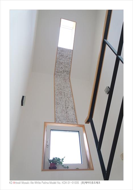 일본식 중목구조 전원주택의 1층과 2층으로 이어지는 계단실 벽과 천장에 시공된 화이트파티나 아트월 시원한 화이트 벽의 조망창과 천장의 채광창을 이어주는 포인트 역할