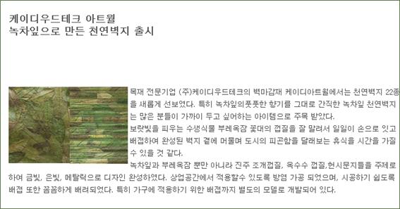 언론보도&광고 [언론보도] 케이디우드테크 아트월 - 녹차잎으로 만든 천연벽지 출시 2012.8