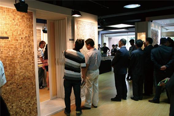 이번에 상설전시장을 오픈하는 KD 우드테크는 친환경 건축자재의 보급을 기치로 내걸고 플로어링과 데크자재인 골드우드, 카본우드 등을 제조, 공급하는 업체이다. KD 우드테크가 야심차게 내놓은 ‘KD 아트월’은 코코넛 열매나 목재의 부스러기, 조개 껍질 등 천연소재를 재가공하여 현대적 감각으로 디자인한 제품으로써, 겉과 속이 다른 ‘친환경’을 표방한 여타의 제품과는 근본이 다른 건축 데코용 마감재이다.