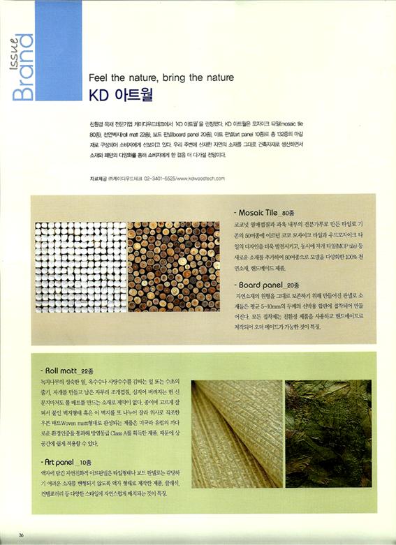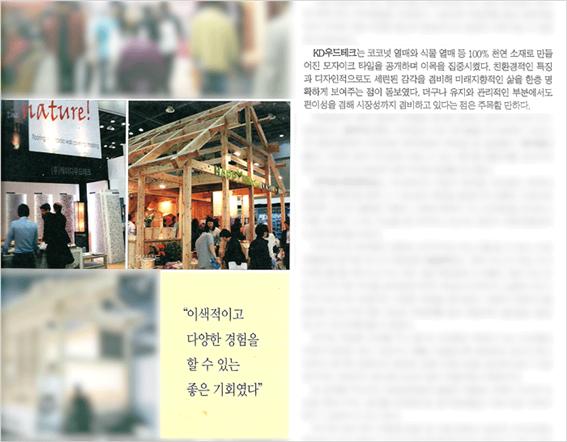 부스 슬로건이었던 'Feel the nature , Bring the nature' 란 주제하에Mosaic tile 80 종board panel 20 종Roll matt 22 종Art Frame 10 종을 설명해주고 있다.또한 MBC 건축박람회 전시회 브리핑에서 "친환경적이면서도 세련된 디자인 감각으로 인해 미래지향적인 삶을 명확하게 보여주는 제품"으로 주목했다.