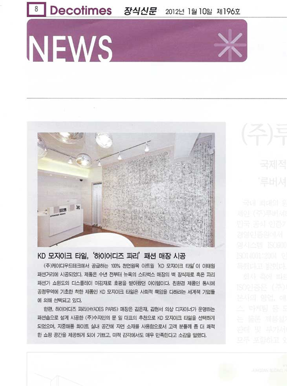 장식신문 2012년 1월 10일자 기사에서 당사의 케이디모자이크타일이 이태원의 패션샵 하이어디스 파리스에 시공된 사실을 알리고 있습니다