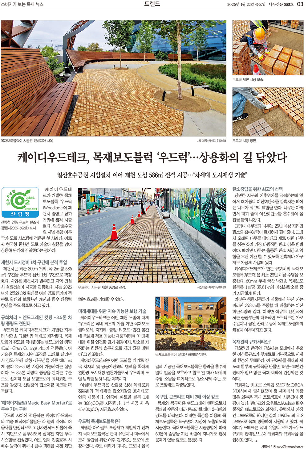 언론보도&광고 [언론보도] 케이디우드테크, 목재보도블럭 '우드럭' 상용화의 길 닦았다 [2026.1.22 나무신문 853호]