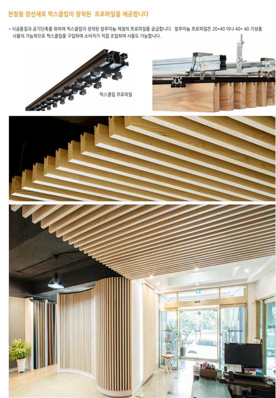 •목재 루버는 기본적으로 다섯가지 형상으로 제공되며 픽스클립이 끼워 지도록 하단부에 긴 홈을 가진 형태로 만들어집니다.