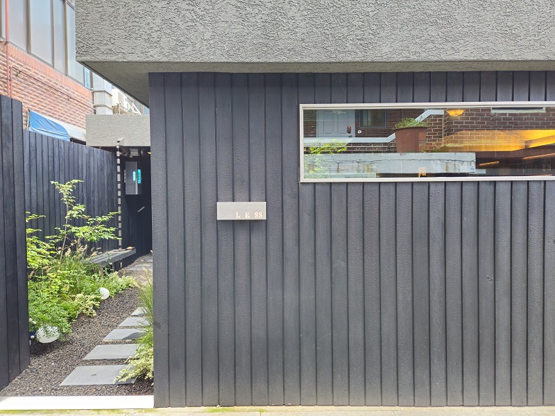 힙스터들의 성지, 성수동의 감각적인 바 'LESS'의 외벽을 케이디우드테크 탄화목 번우드 찬넬03으로 마감했습니다.