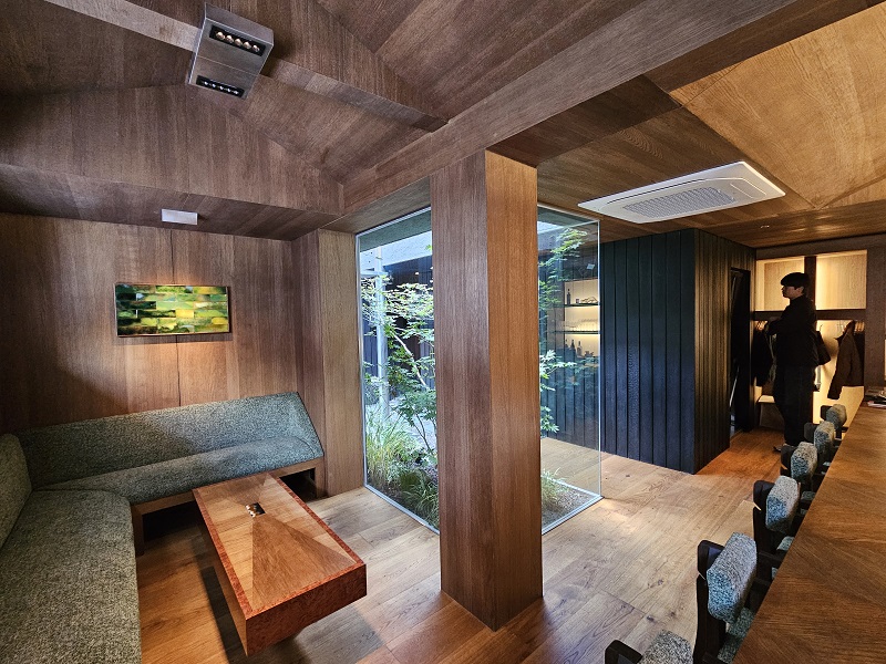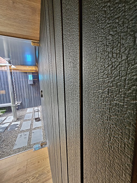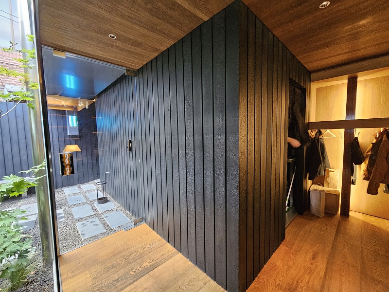 탄화목 특유의 거칠지만 섬세한 질감과 깊은 블랙 컬러가 주변의 번잡함에서 벗어나 오직 공간 자체에 몰입하게 만드는 웅장하고 미니멀한 입구를 완성합니다.