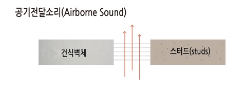 공기전달 소리에 대해 생각할 때 우리는 빈 공간에 집중해야 합니다. 스터드벽에서 이러한 빈 공간은 건식벽체 패널과 스터드사이에있습니다.음파가 건식벽체에 부딪치면 많은 고역 및 중역 주파수가 흡수되어 결국 열이됩니다. 그러나 저주파 음파는 다릅니다.그들은 건식벽체를 진동시켜 음파를 벽을 통해 다음방으로 전달 합니다.