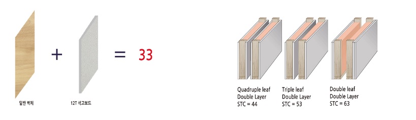 위 그림 좌측과 같이 설치된 단순한 벽은 STC값 33에 불과합니다. 이러한 벽체는 방음이 잘 안되므로 벽 건너편의 목소리를 들을 수 있고, 고려 되어서는 안됩니다.벽체 사이에 흡음 충진재가 채워진 위 우측 3Type 건식 벽체 패널을 보면 STC가 최대 약 44~63까지 올라가 대부분의 건축 법규를 충족합니다.이 벽체들은 목소리가 더 이상 들리지 않고 확성기의 소리가 희미해집니다. 하지만 여전히 큰 볼륨의 서브 우퍼가 작동하면 옆집의 수면에 방해가 될 수 있으므로 홈시어터룸에 적용하는 것은 어렵습니다.