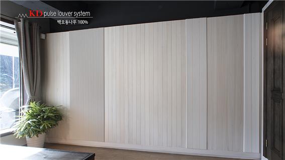 오동나무 원목루버의 새로운 방염완료 오버코트 인테리어 루버