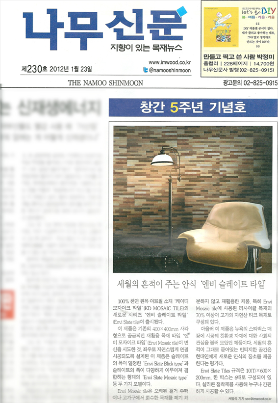 2012.1 나무신문 230호에 기재된 우드모자이크 타일 관련 기사입니다.