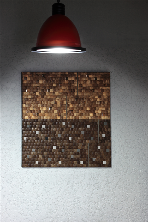 기본적인 목재 모자이크 타일에 세라믹 타일을 랜덤하게 매치시켜 감상의 묘를 더하였다. 액자 형식으로 걸수 있도록 완성하였으며, 원하는 벽면에 쉽게 걸 수 있다. 고급스러운 천연 질감과 디자인으로 주거 및 상업공간 어느 곳에서도 자연스럽게 조화될 수 있다. 집들이, 생일날 등의 특별한 선물로도 적합하다.
