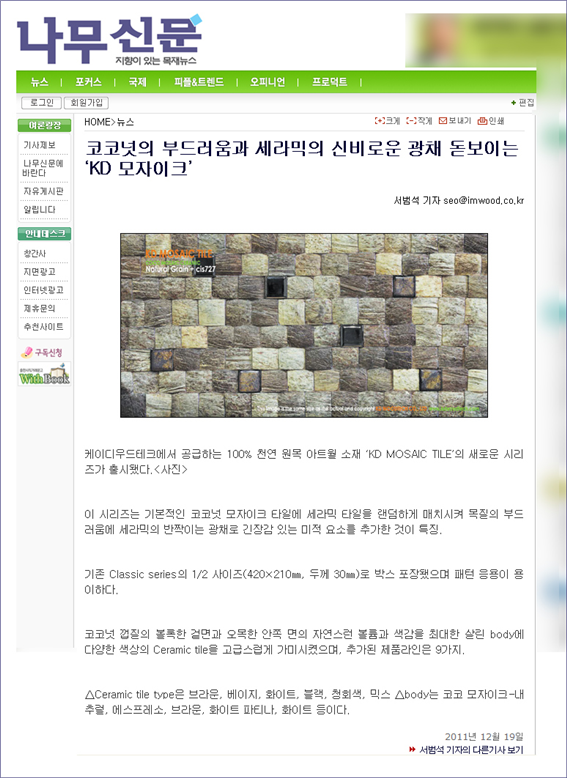 2011년 12월 19일자 나무신문에 당사의 케이디모자이크 타일의 신제품에 대한 기사가 게재되었습니다.