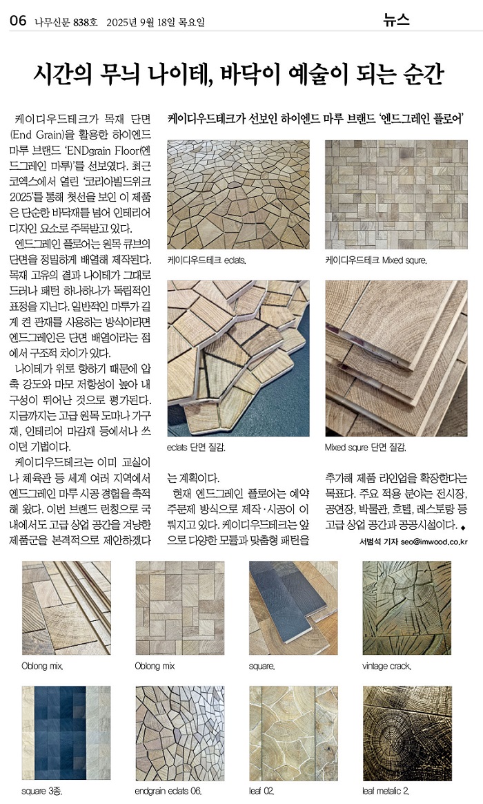 언론보도&광고 [언론보도] 시간의 무늬 나이테, 바닥이 예술이 되는 순간…케이디우드테크 ‘엔드그레인 플로어’ [ 나무신문 838호 2025.…